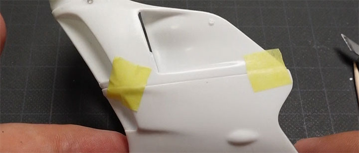 このあと表面はパテや瞬間接着剤を盛りなだらかにします。フロントアッパーカウルとサイドカウルの接合は、前の方はこれでOKです。