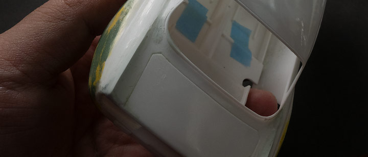 エポキシパテが硬化したら凸凹したところをポリパテ(タミヤ・黄色)で埋めて、その次は同様にラッカーパテ(緑色)で埋めて、順番にキレイにしていきます。