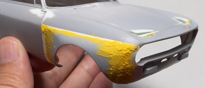 オーバーフェンダーのカタチを変更したり、ルーバーに穴を開けたり、その他いろいろとカタチを変えたボディをキレイに整えていきます。