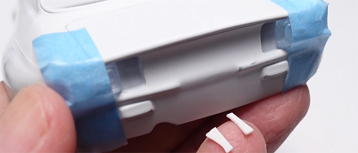 テールランプの透明パーツを仮止めしておいて、プラ板を小さくカットしたものを……。