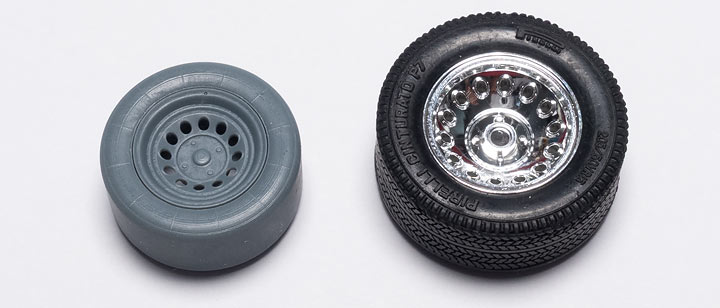 右がキットのタイヤ&ホイールですが、こんなに大きさが違うのです。